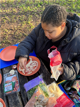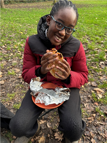 We filled our pitta breads with tomato passata, cheese and a selection of ingredients, and then wrapped them up and cooked them on the campfire.