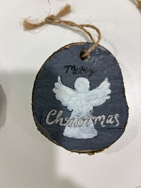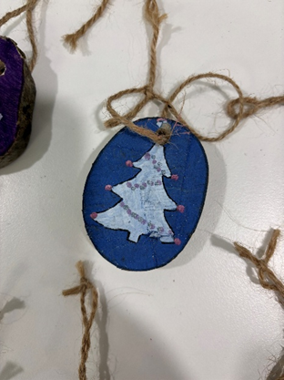We decorated the discs using acrylic paint and festive stencils, and then threaded a piece of string through the hole to hang the decoration from a Christmas tree… do you like them?